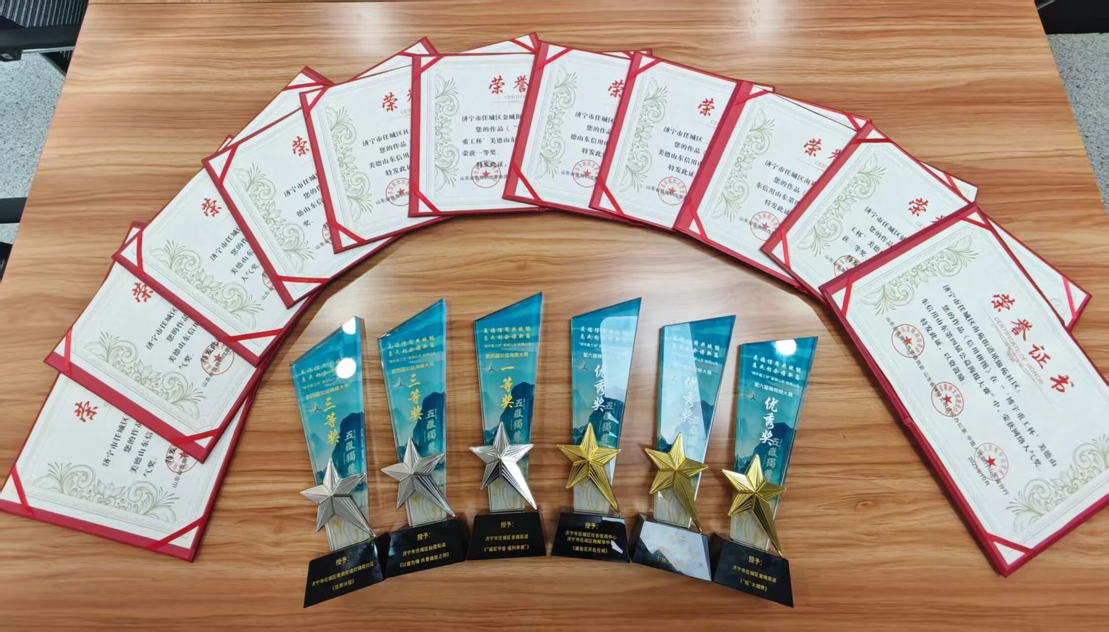 在本次大赛中,任城区有6部微视频作品和5幅海报作品,在全省征集的227部微视频和339幅公益海报作品中脱颖而出,获奖数量全市第一且为历年最高记录,充分展现任城社会信用体系建设取得的显著成效与文化积淀。其中,由金城街道报送的海报作品《诚实守信 福利来袭》斩获一等奖,南苑街道报送的海报作品《信用拼图》、仙营街道报送的海报作品《以信为壤 共育诚信之树》获评三等奖,区社会信用中心、区融媒体中心报送的微视频《诚信花开在任城》、金城街道报送的微视频《“信”火相传》和二十里铺街道报送的微视频《“信”福满江庙》荣获优秀奖。